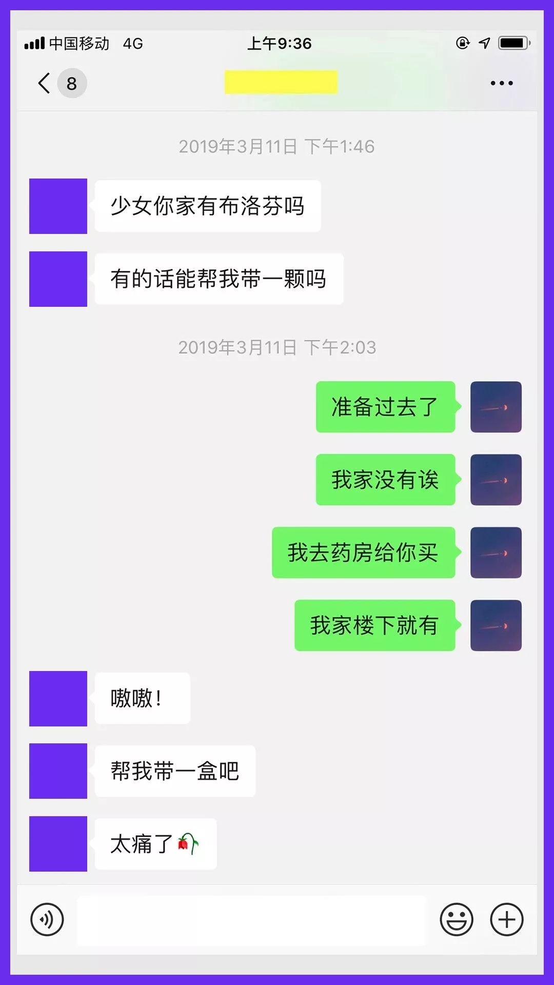#女孩痛经求布洛芬的对话截图