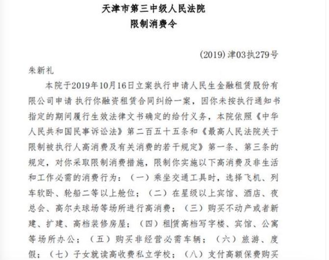 12月2日天津市第三中级人民法院向朱新礼发布限制消费令,限制其乘坐飞机和动车、购买不动产、子女就读高收费私立学校等。这是他今年以来收到的第4个限制消费令。
