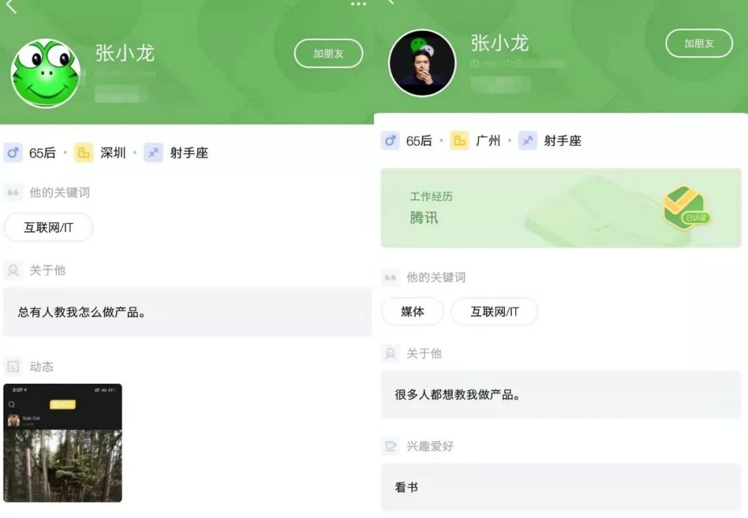 在朋友App中,发现有两个“张小龙”账号,一个认证,一个非认证