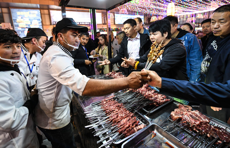 在乌鲁木齐五一星光夜市,人们排队购买烤羊肉串等美食(5月6日摄)。新华社记者 王菲 摄