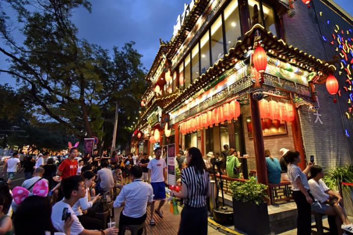 8月7日,人们在北京东城区簋街的餐饮店外等候吃夜宵。新华社记者 李欣 摄