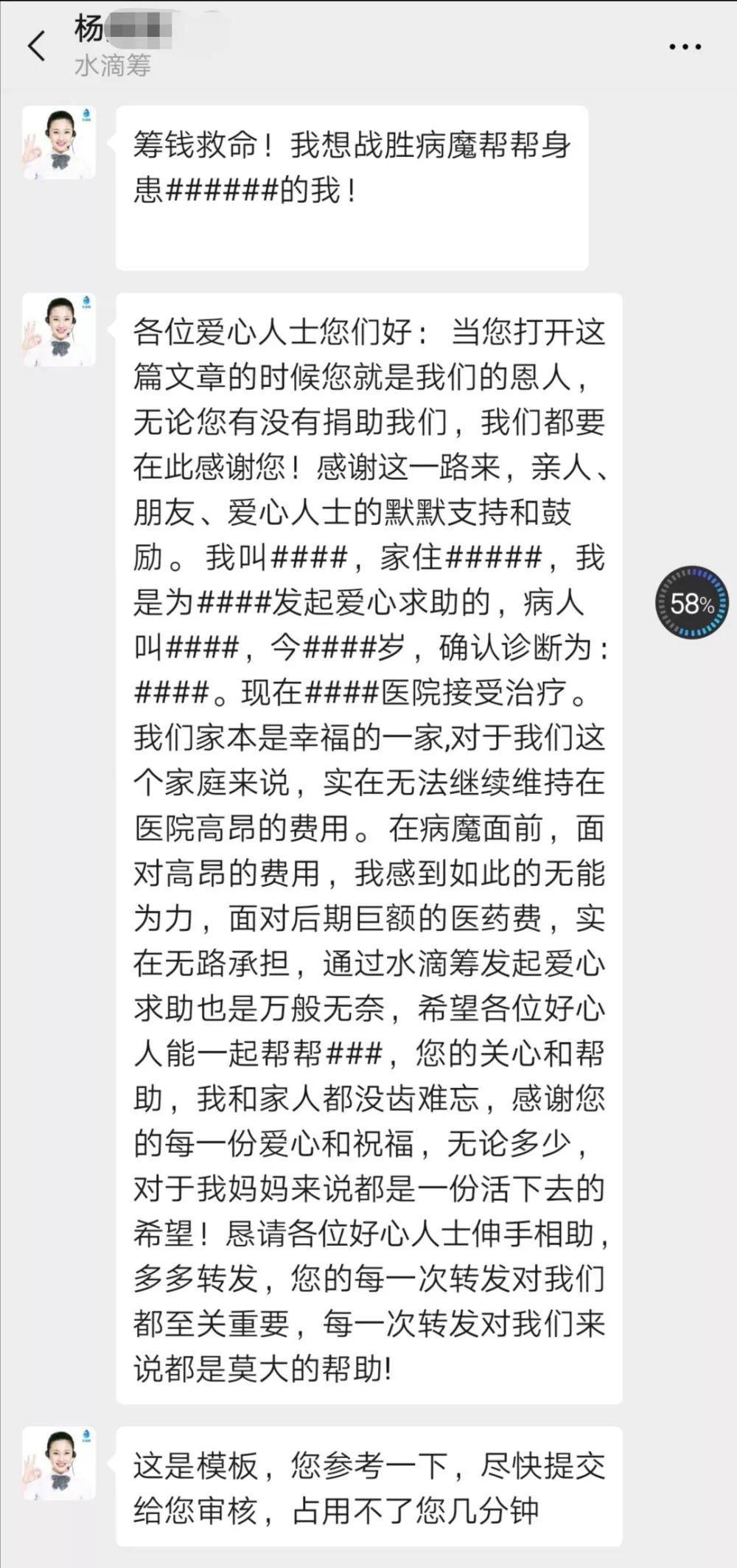 同时,对方还提供了用以向社会公众筹款的套用文字模板。在模板中,不乏“筹钱救命!”“我们家本是幸福的一家,对于我们这个家庭来说,实在无法继续维持在医院的高昂费用。”“恳请各位好心人士伸手相助,多多转发。”等用语。