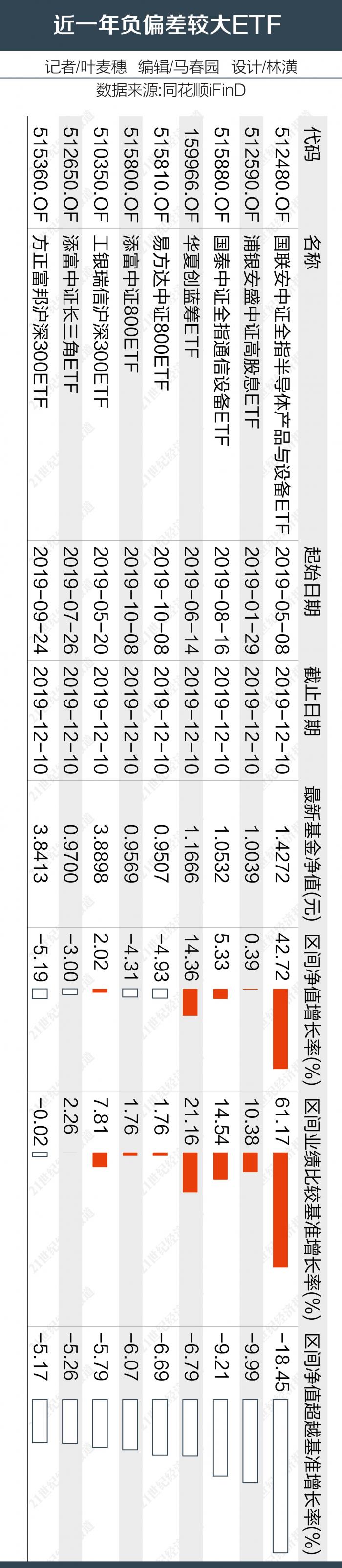 根据同花顺统计,按照过去一年来计算(2018年12月11日至2019年12月10日),与区间业绩比较基准出现负偏差的ETF有90只,其中偏差幅度超过5%的ETF有10只,超过10%的ETF有1只。