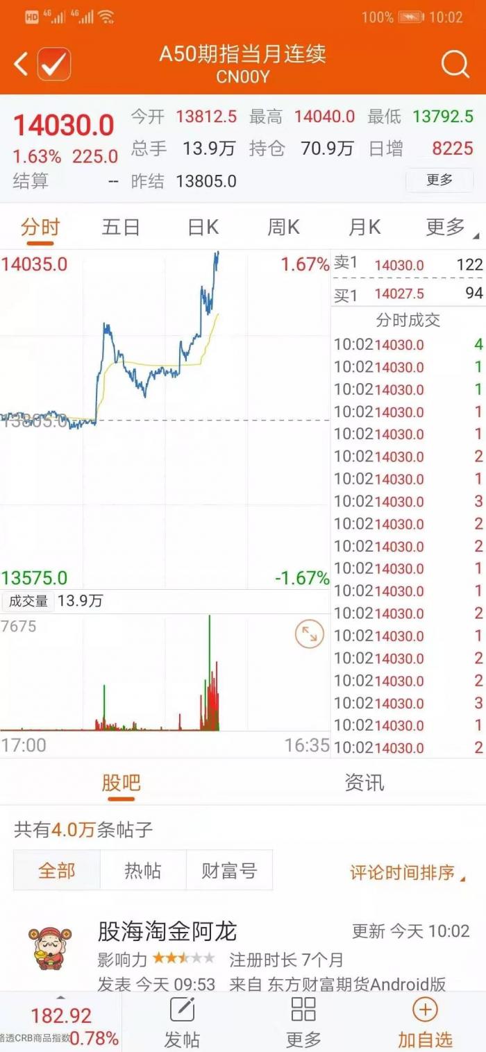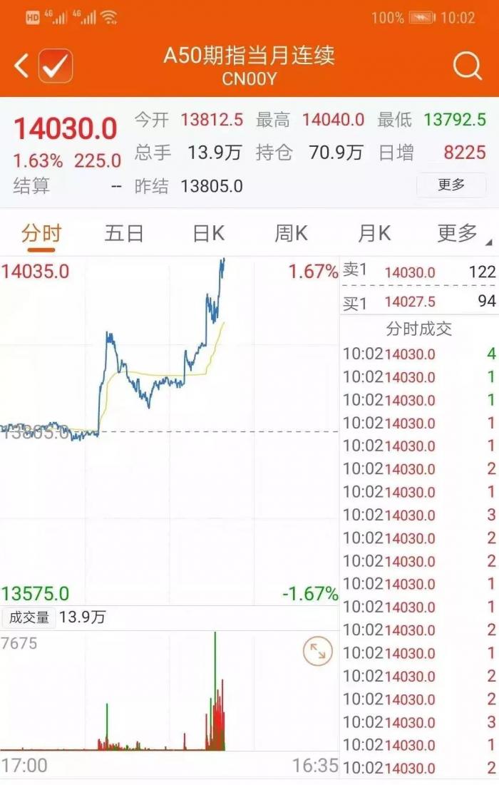 昨晚特朗普发推后,在新加坡期货交易所上市的A50股指期货立即直线飙升近1%。
