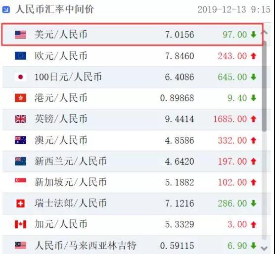 中国外汇交易中心的数据显示,12月13日早上,人民币兑美元中间价调升97个基点,报7.0156,为4连升。前一交易日人民币兑美元中间价报7.0253,16:30收盘价报7.0333,23:30夜盘收报7.0280。