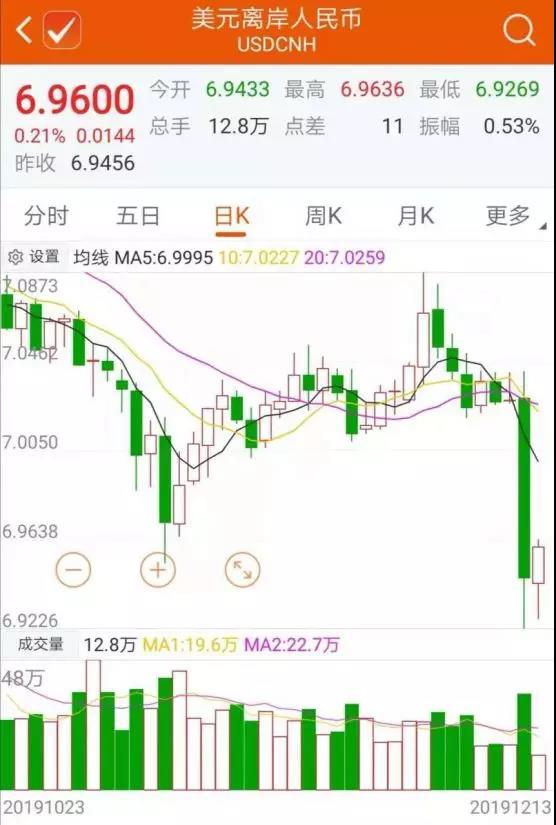 受外盘消息影响,12月12日晚间,离岸人民币对美元汇率快速拉升,从7.03一线直线飙升突破多个关口,最高升至6.9667,日内升值一度超过600个基点。前一交易日离岸人民币对美元汇率报7.0280。