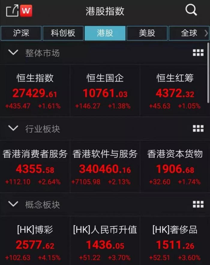 恒生指数高开1.85%,创逾一个月新高,权重股全线上涨,其中腾讯控股涨超3%触及360港元关口。