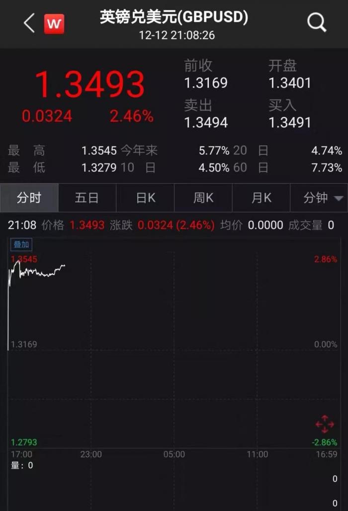 受保守党在大选中胜出的消息影响,12月13日亚太盘初,英镑兑美元短线飙升240点,刷新3月下旬以来高位至1.3420上方。之后日内涨幅一度扩大至2.86%,创2017年1月以来最大单日涨幅,刷新2018年1月以来新高至1.3545。日内当前涨幅大约2.2%。