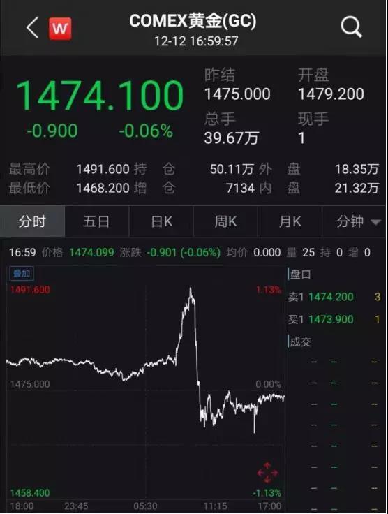截至收盘,纽约商品交易所2月交割的黄金期货价格下跌2.70美元,跌幅0.2%,收于1472.30美元/盎司,盘中一度上涨至1491.60美元/盎司。