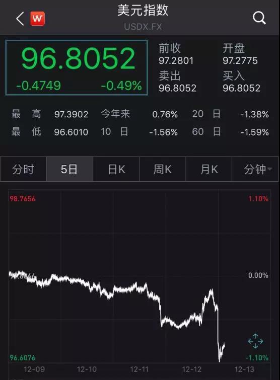 美元指数则开盘暴跌,目前短线下挫约50点,跌破97关口,刷新日低至96.6。
