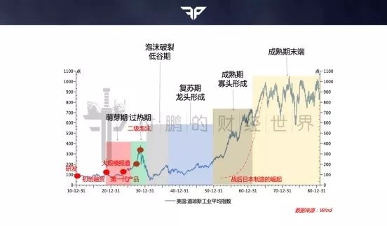 很多人从微观、宏观角度去解释1929年美国股灾,但从产业生命周期角度看,1929年股灾是躲不过的一劫,它跟2000年互联网泡沫及中国IT行业发展路径极为相似(如下图)。在产业生命初期都要经历一轮泡沫,之后泡沫出清,逐步形成龙头和寡头,最后企业利润增长放缓,股价进入成熟期末端的震荡。