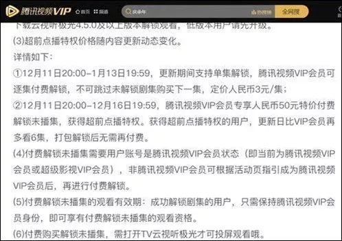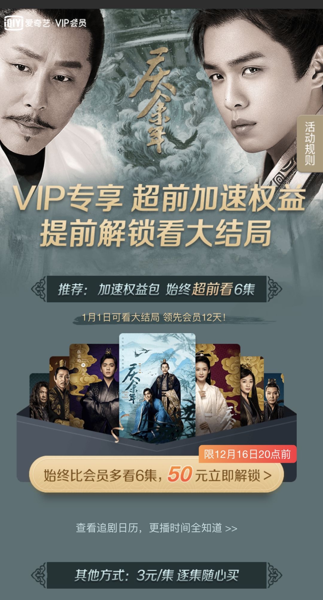 按照规则,会员额外再付费50元便可在剧集更新日始终比普通会员多看6集,这样1月1日便可看到大结局。
