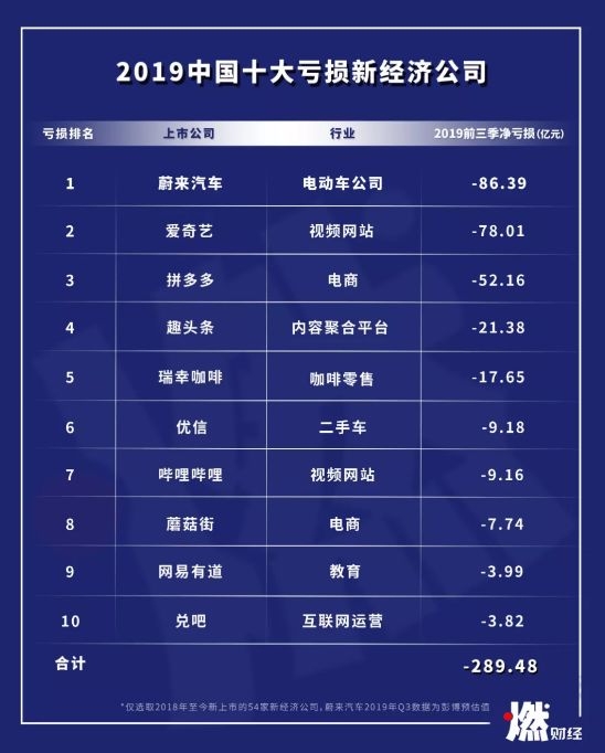 在燃财经公布的 “2019中国十大亏损新经济公司”榜单中,若按2019年前三季度净亏损金额来算,爱奇艺则以78.01亿的亏损额位居第二。