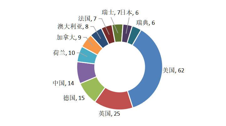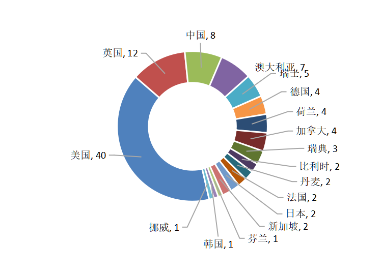 分析发现,美国、英国、澳大利亚、中国(中国内地和中国香港)、瑞士、德国、荷兰、加拿大、瑞典、比利时、丹麦、法国、日本、新加坡、芬兰、韩国和挪威共17个国家拥有2020年世界大学第三方指数得分TOP100的大学。其中数量最多的是美国,共计40所,其次是英国12所、中国8所(中国内地大学6所、中国香港2所)、澳大利亚7所和瑞士5所。