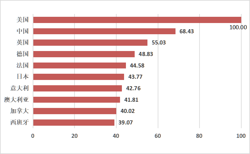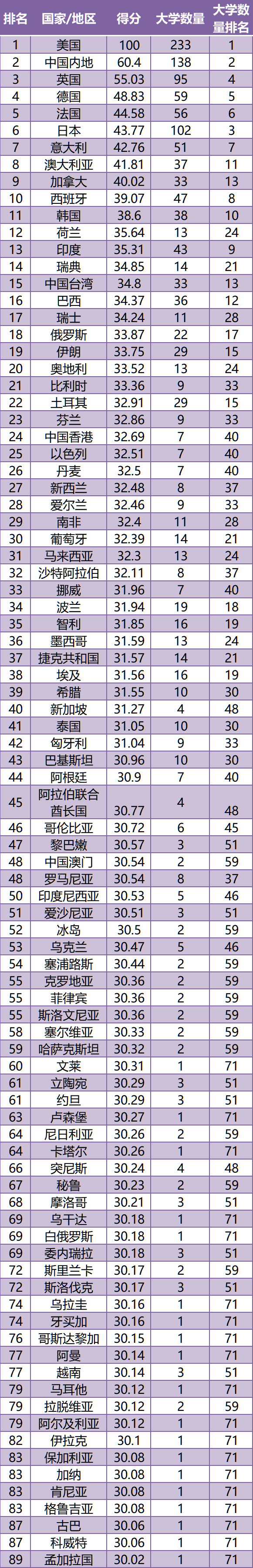 2020年86个国家的高等教育第三方指数得分计算结果中,美国高等教育竞争力水平排名第1,高等教育指数得分为100,领先于排名第2的中国(高等教育指数得分68.43)和排名第3的英国(高等教育指数得分55.03)。德国、法国、日本、意大利、澳大利亚、加拿大和西班牙分列第4至第10名。在89个国家/地区高等教育第三方指数中,中国内地高等教育竞争力指数为60.40,排在第2位,中国台湾排名15,中国香港排名24,中国澳门排名48。