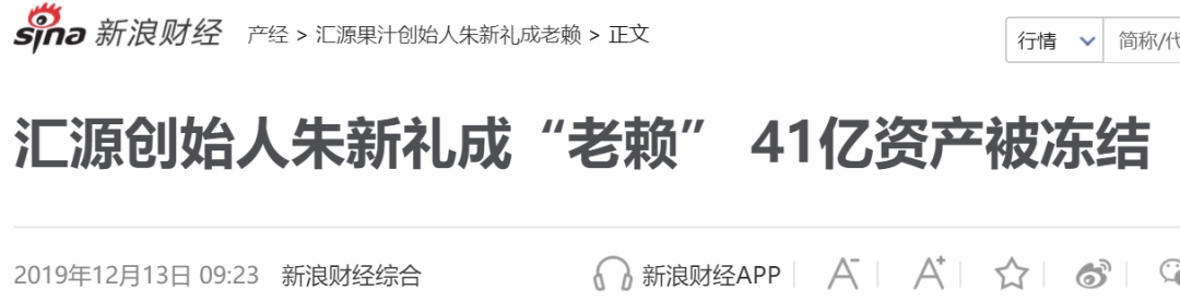 12月2日,汇源创始人朱新礼被天津法院限制高消费,和王思聪、罗永浩一样,暂别飞机酒店、高尔夫。 12月11日,朱新礼作为有权代理人的德源资本被法院查封,41亿元资产遭冻结。