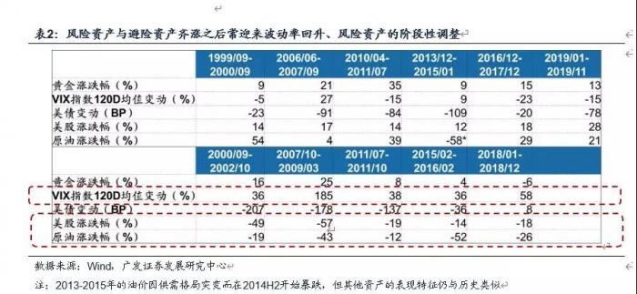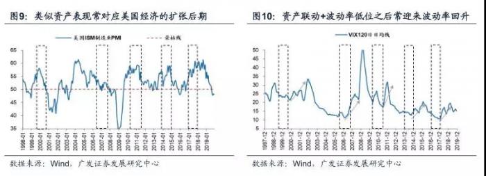 风险资产与避险资产齐涨的鲜明特征具有较强的指示意义,类似资产组合表现常指向美国一轮经济小周期的扩张后期,之后波动率回升、风险资产阶段调整。19年风险和避险资产齐涨,美股、美债、黄金、原油在19年均录得正收益,且美股波动率明显下行。类似情景自00年以来出现过5次,每次持续时间为12-15个月。风险和避险资产同涨,反映投资者对于资产价格的争议加大,类似大类资产表现常发生于美国一轮经济小周期的扩张后期。资产联动性增强(分散性降低)+波动率处于阶段低位的组合,也往往会在之后迎来波动率的上行和风险资产的阶段调整。