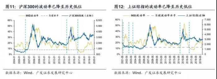 A股波动率降至历史低位,回升动能增强。从沪深300指数角度来看,A股当前的波动率低位仅在2006年4月、2014年7月-11月、2016年9月触及过该水平。从上证综指角度来看,2001年7月、2002年11月、2003年9月、2014年7月-10月、2016年10月触及过当前的低位。以上除了2016年9月-2018年2月之外,其余情况下波动率均在当前值附近回升。波动率触及低点往往意味着市场对已知的正反面信息充分反应,具有较强的拐点或抱团行情指示意义。