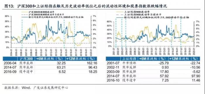 除牛市顶点之外,波动率触及低位之后6个月内A股的下跌概率有限(0/6),但上涨幅度和持续性则取决于经济增长(06年利率上行但经济强劲)、流动性(14年宽松、16年收紧),以及整体大势所处阶段(02年、03年仅为熊市反弹)。