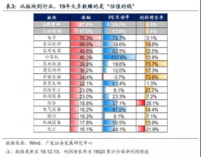 估值的三个决定因素分别是:广谱利率/盈利预期/风险偏好,我们看到2019年“金融供给侧改革”引导这三个因素同时超预期,共同带来了A股估值显著扩张。