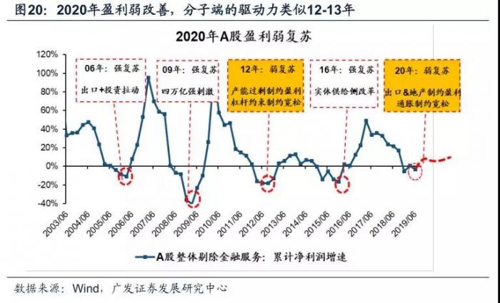 与历史上的盈利周期相比,2020年更像12-13年,是一轮弱复苏的盈利周期,对股市有正向驱动但并非“强牵引”。A股历史上四轮盈利底部分别出现在06年、09年、12年、15年,19年Q2确认第五轮盈利底。06年经济处于黄金增长期、外需与投资提振经济强劲复苏,08年末“四万亿”强刺激政策出台,15年流动性极度宽松、并在年底启动“实体供给侧改革”,A股都形成了“盈利尖底”,强劲回升的势头与当前情形明显差异。12年受产能过剩和债务杠杆制约,盈利圆弧底、弱复苏;19年与之相似,宏观审慎对稳增长力度有所约束,预计明年弱复苏正增长。由于盈利弹性小于估值弹性,2020年A股期望收益率不及19年但大概率为正。
