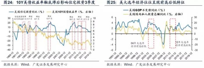 货币政策效应减弱叠加大选效应,美国经济20H2可能再度承压。长端利率止跌回升将对美国消费、融资、投资等产生1-3个季度的滞后影响。根据广发宏观,美联储扭转利率操作将使得10Y美债收益率止跌回升,事实上19年8月份以来10Y美债收益率已回升约40BP,长端收益率上升对美国消费/融资/地产投资滞后影响分别为1/1~2/3个季度。近期包括非农在内的美国经济数据超预期,明年降息概率下降也将推升长端利率上行。20年11月总统大选掣肘财政发力,美经济可能重演大选年前高后低表现。2004年和2008年大选年美国经济呈现典型的前高后低特征,背后逻辑反映了大选年两党博弈逐级升温,有效财政政策难以落地。20H2美国经济可能受此影响再度承压。