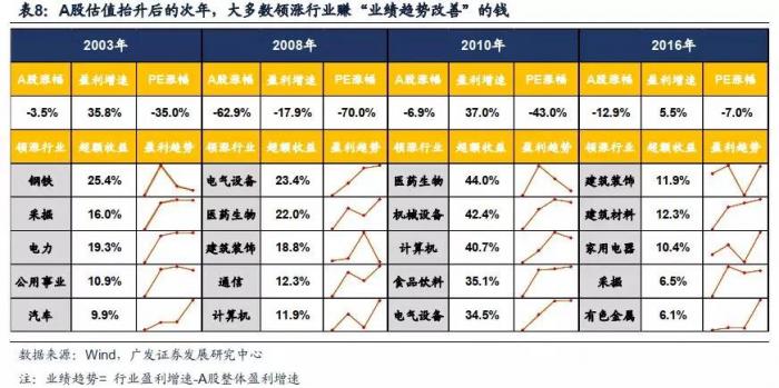 我们前文提到,20年A股盈利驱动取代估值成为主导。历史上A股拔估值后的下一年,盈利牵引强于估值驱动,寻找“业绩确认”是行业配置的主要线索。19年领涨的行业,估值变动率显著胜过股价涨幅,估值的贡献率更大。但从A股历史上大幅拔估值之后的下一年(例如03、08、10、16等),大多数涨幅排序靠前的行业赚的是“业绩的钱”,即行业盈利增速相较于A股整体的趋势处于持续改善的通道中。因此,2020年行业配置思路从“分母端”更受益的品种切换至“分子端”。