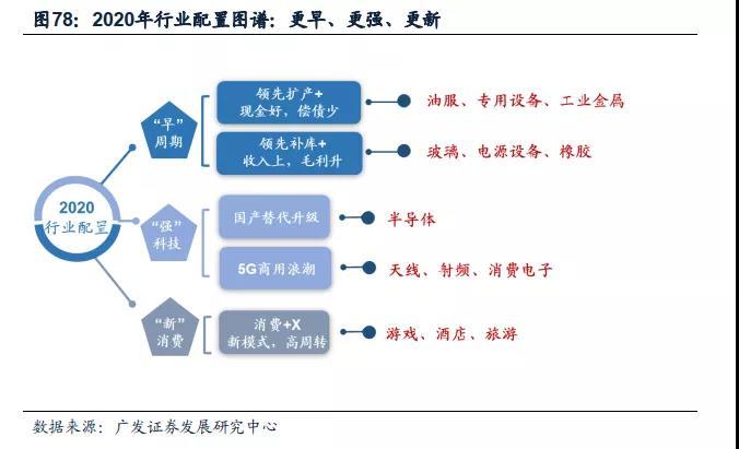 2020配置围绕三个确定性(补库周期、通胀节奏、5G商用)。更早:顺周期率先补库+扩产。油服、工业金属、玻璃;更强:自主可控与5G商用。半导体、天线、射频、消费电子;更新:从传统到新兴。游戏、酒店、旅游。