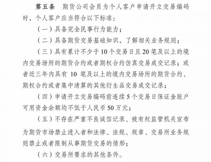 答:根据《中国金融期货交易所交易者适当性制度管理办法》第五条规定,期货公司对交易者就市场、产品的认知能力、风险控制与承受能力和经济实力的评估要求。其中明确规定申请开立交易编码前连续5个交易日保证金账户可用资金余额均不低于人民币50万元。