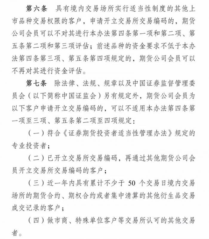 答:《中国金融期货交易所交易者适当性制度管理办法》第六条规定,具有境内交易场所实行适当性制度的其他上市品种交易权限的客户,申请开立交易所交易编码的,期货公司会员可以不对认知能力和交易记录进行评估。但前述品种的资金要求不低于“申请开立交易编码前连续5个交易日保证金账户可用资金余额均不低于人民币50万元”的,期货公司会员才可以不再对其进行资金评估。另外,《中国金融期货交易所交易者适当性制度管理办法》第七条规定,专业投资者、已开立交易所交易编码的客户、长期客户、做市商、特殊单位客户,期货公司会员可以不对认知能力、交易记录、经济实力进行评估。