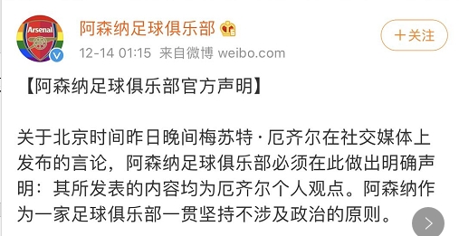 为此,拥有500万粉丝的阿森纳俱乐部官方微博于14日凌晨迅速做出声明。“关于北京时间昨日晚间梅苏特.厄齐尔在社交媒体上发布的言论,阿森纳足球俱乐部必须在此做出明确声明:其所发表的内容均为厄齐尔个人观点。阿森纳作为一家足球俱乐部一贯坚持不涉及政治的原则。”