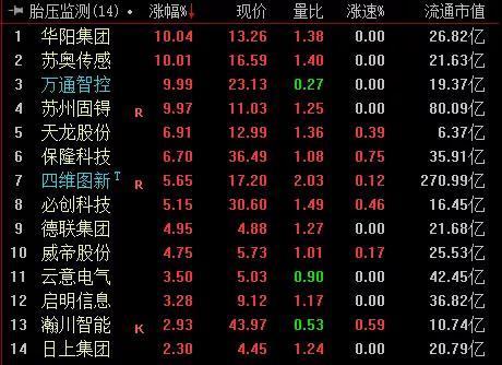 12月16日,胎压监测板块全线大涨,华阳集团、苏奥传感、万通智控、苏州固锝四股涨停,天龙股份、保隆科技、四维图新、必创科技涨幅均在5%以上。