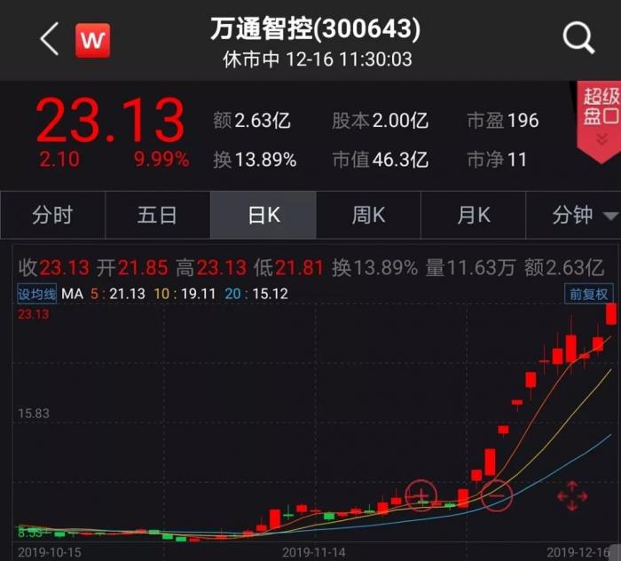 其中,以万通智控的股价最为活跃。万通智控在最近的12个交易日内K线12连红,其中包括了7个涨停板,股价也从11元下方上涨至今日的23.13元,涨幅超过100%。