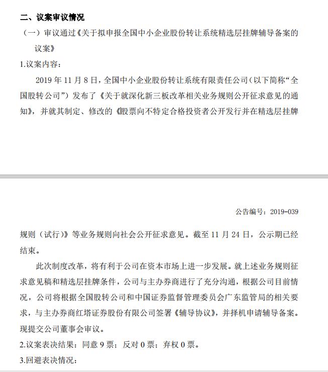 此次制度改革,将有利于公司在资本市场上进一步发展。就上述业务规则征求意见稿和精选层挂牌条件,公司与主办券商进行了充分沟通,根据公司目前情况,公司将根据全国股转公司和中国证券监督管理委员会广东监管局的相关要求,与主办券商红塔证券股份有限公司签署《辅导协议》,并择机申请辅导备案。现提交公司董事会审议。