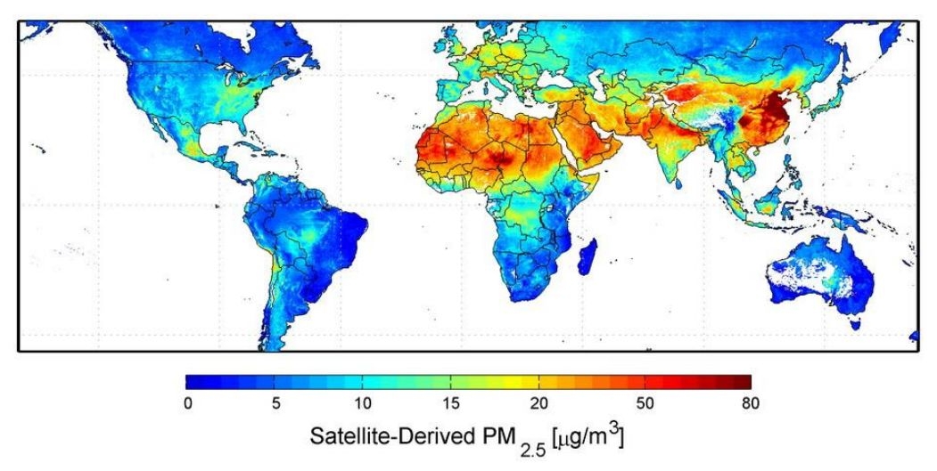 图1:NASA公布的全球PM2.5平均浓度地图,中国中东部区域为重灾区