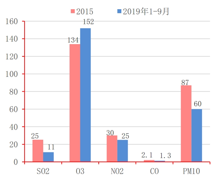 据生态环境部2019年9月数据显示,我国现有337个地级及以上城市基本已经完成“蓝天保卫战”计划中所规定的减排目标,仅臭氧一项浓度较2015年有所上升,但作为可天然分解的非核心污染物,对整体大气环境质量影响相对较小。