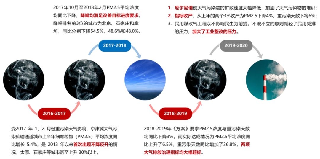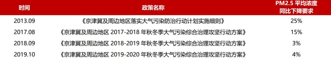 环保政策的调整引起了市场的误解,一时间“弱环保、保经济”的市场解读甚嚣尘上;同时由于各地方的限排政策仍存在不完善性,部分散乱污的排放企业趁机死灰复燃,由此导致2018-2019年京津冀地区的大气排放指标严重超标。据生态环境部披露,原计划分别都应同比降低3%的PM2.5浓度与重污染天数,在2018-2019年期间分别增加了6.5%与36.8%,是近年来京津冀大气环保达标情况最差的一期成绩。