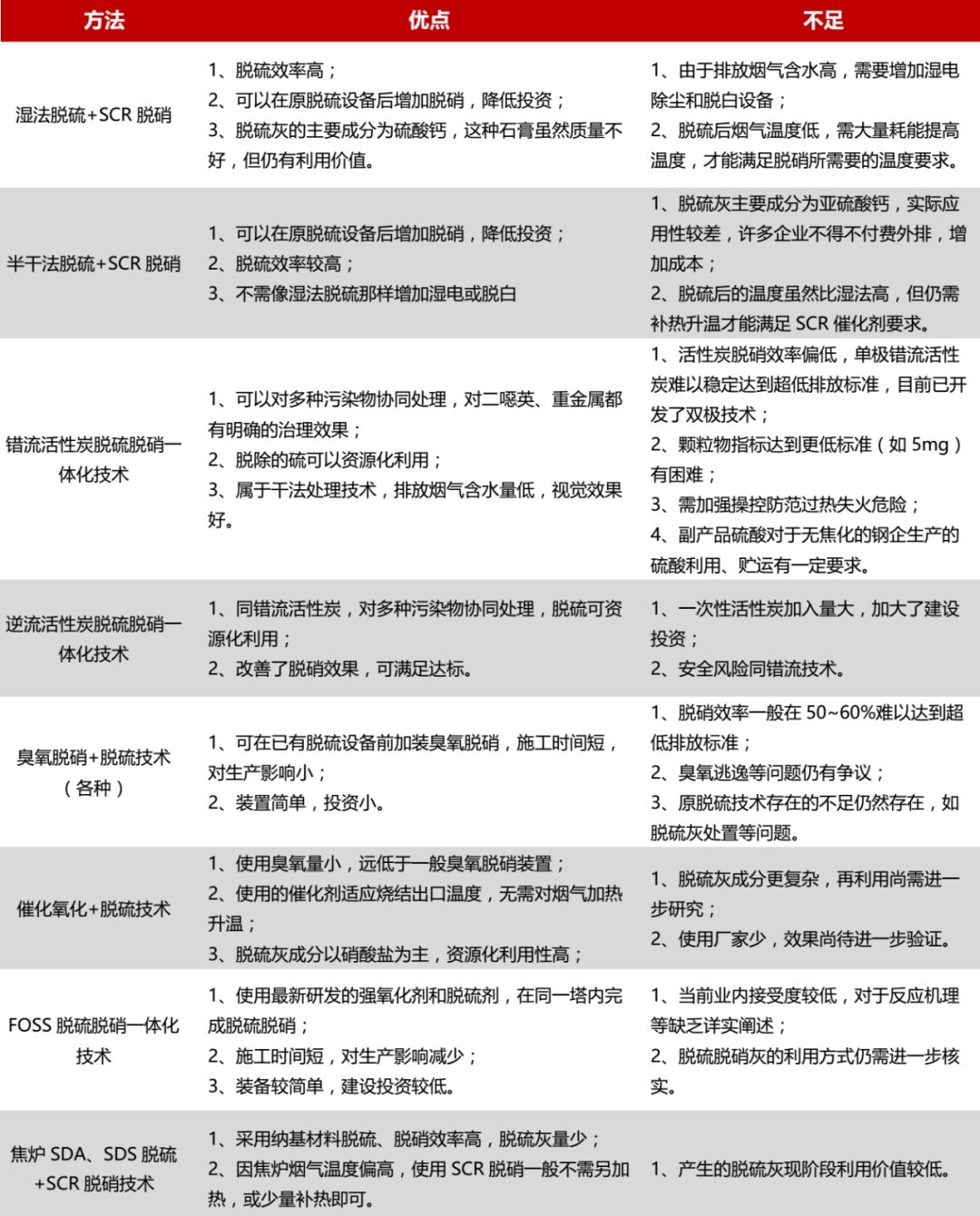 在末端治理方面,现阶段钢铁行业主流的脱硫+脱硝+除尘技术有:脱硫(湿法、半干法)+SCR脱销、活性炭(错流、逆流)法、氧化法(臭氧、氧化催化、FOSS)等。各类方法的优缺点在现实运营中也体现得较为明显,具体见下表。