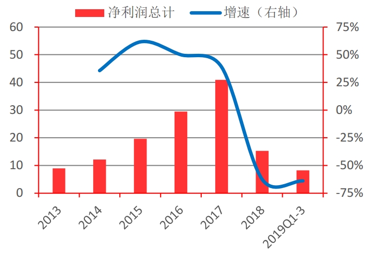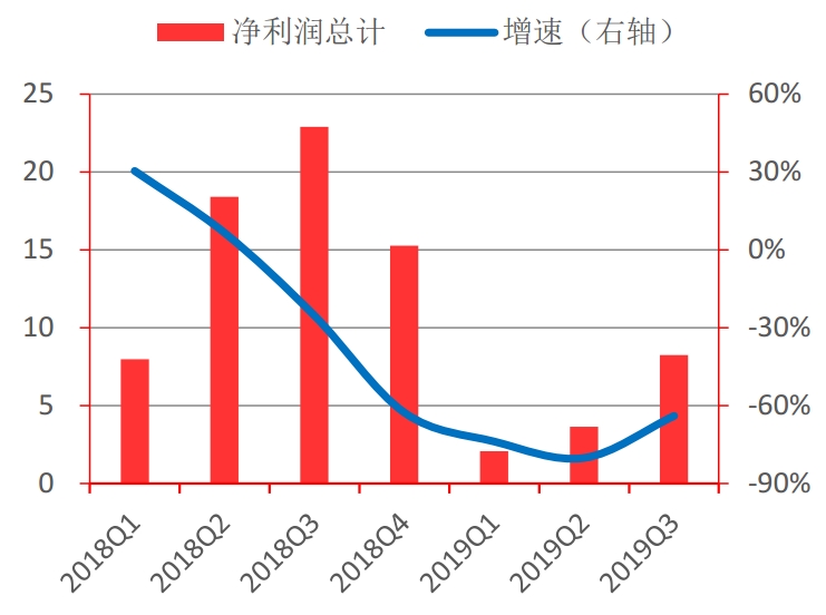 1)营收惨淡。自2018年三季度开始,行业营收增速出现断崖式下跌,截至目前已连续五个季度负增长,2019年三季度同比营收增速为-16.57%。营收恶化的主要原因在于下游火电行业的景气度下降,同时叠加产废央企的下属环保子公司的崛起挤出了部分民企市场订单。