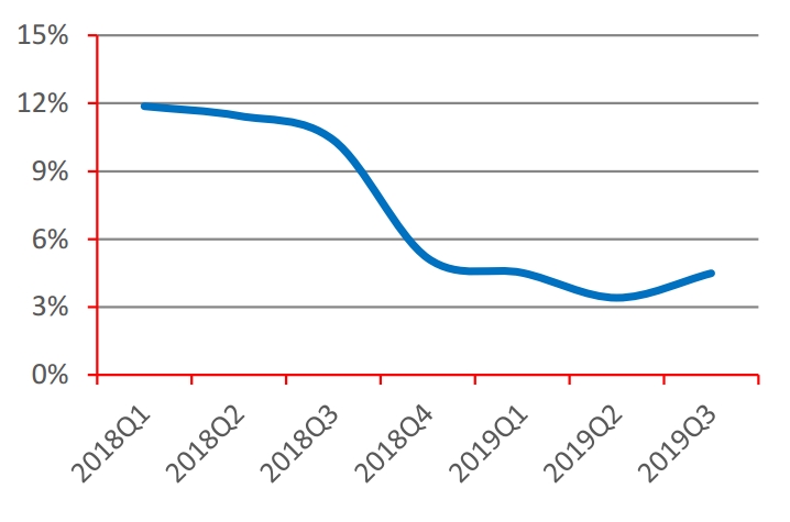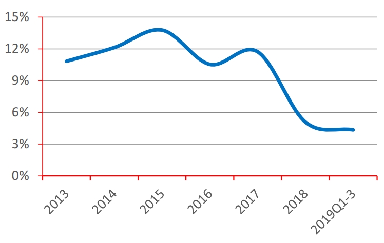 从利润率角度看,大气治理行业毛利率表现持续低迷,自2018年年尾一轮暴跌后目前维持在4.36%左右,2019年前三季度毛利率水平分别为4.24%、3.06%、4.36%左右。