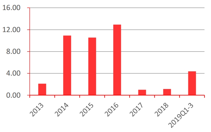 2019年二、三季度行业经营性现金流净额水平出现明显改善。回顾大气行业公司经营性现金流状况,从2016年的12.93亿元陡然降低至2017年的0.99亿元。 图21:经营性现金流净额年度值(亿元)