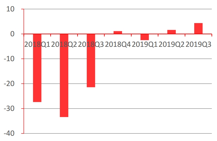 从行业经营环境角度分析,我们认为这与2017年所推行的简单粗暴的工业限产“一刀切”政策有关;自2018年政府实行差异化的限排政策后,行业流动性于2018年第四季度开始由负转正,至2019年二季度与三季度经营性现金流净额累计值已分别达到1.61亿元、4.37亿元。