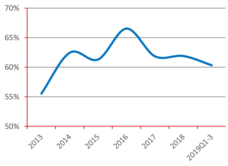 ■行业营收连续5个季度负增长,2019年三季度营收同比增速仅为-16.57%。营收恶化的主要原因在于下游火电行业的景气度下降,同时叠加产废央企的下属环保子公司的崛起挤出了部分民企市场订单。目前行业的营收增速与流动性均已出现小幅改善,原因在于随着下游订单来源由火电转向景气度较好的钢铁等非电行业,在拓宽了市场空间的同时,也减轻了针对上游环保企业的压款意愿。近年来行业资产负债率基本企稳在60~62%以内,较2016年出现了一定的下滑,原因在于受近年来经营状况恶化影响,行业举债经营能力也出现了弱化。