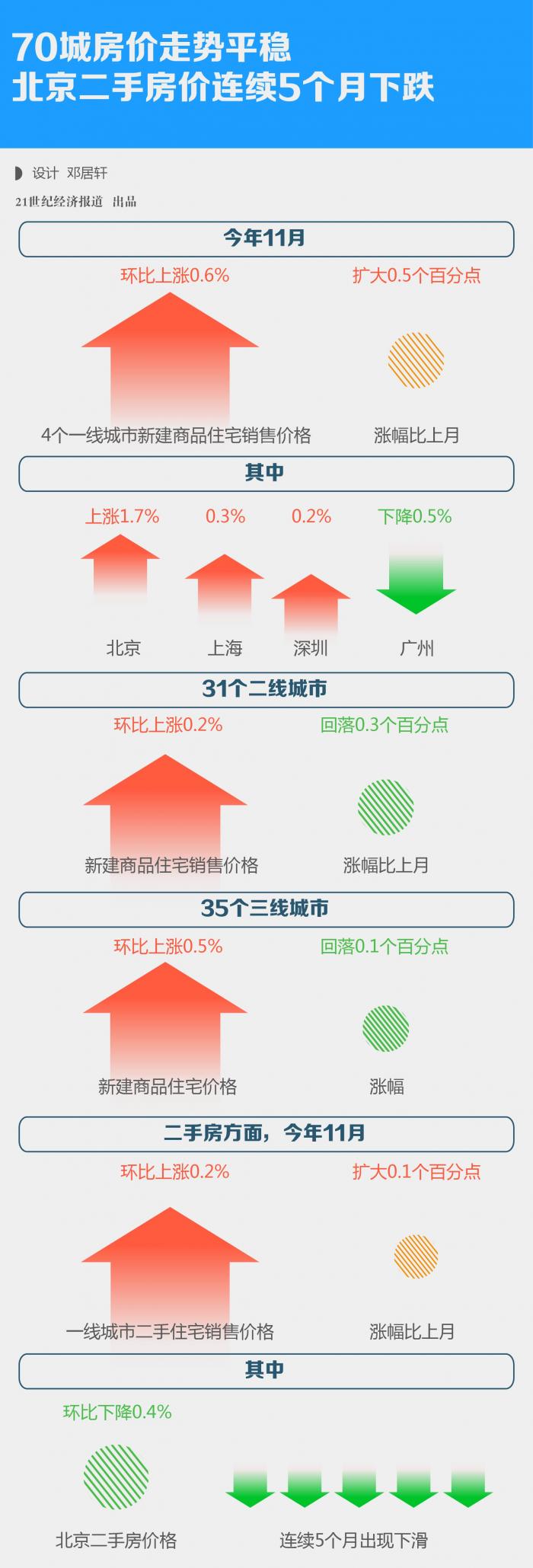 二手房方面,今年11月,一线城市二手住宅销售价格环比上涨0.2%,涨幅比上月扩大0.1个百分点。其中,北京二手房价格环比下降0.4%,连续5个月出现下滑。