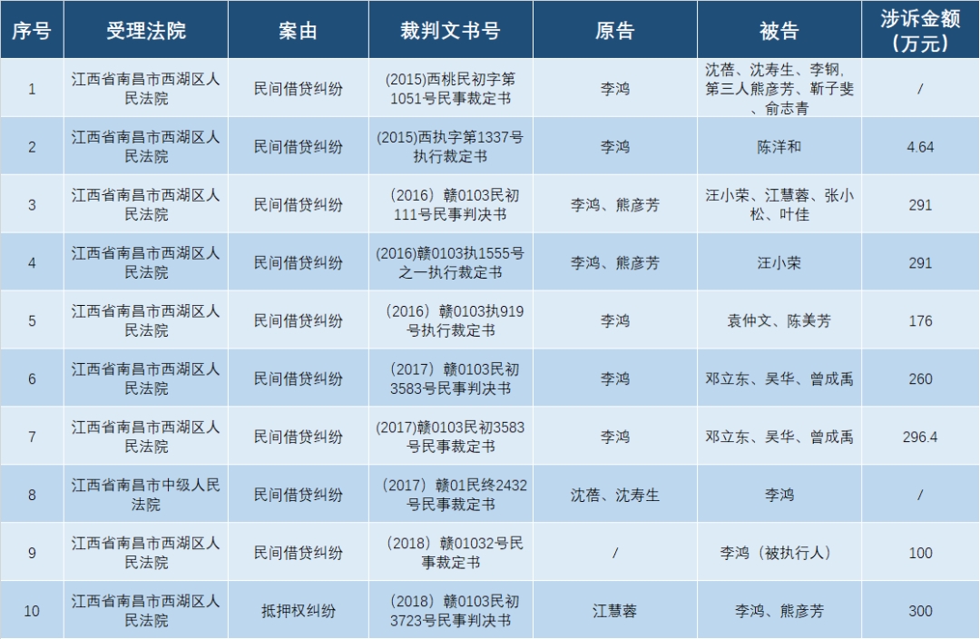 通过中国裁判文书网、中国执行信息公开网查询显示,李鸿、李昱近年来最少有10起案件涉及民间借贷纠纷,并经各级法院审理和出具相关法律文书,涉诉金额近2亿元人民币。从他们所涉诉案件来看,除一个执行案件外,二人均为出借人,部分借款收取利息高达月息3%。