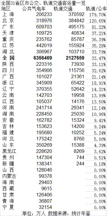 如果从2018年的数据来看,山西、内蒙古、海南、西藏、甘肃、青海、宁夏的轨道交通客运量仍然为零。