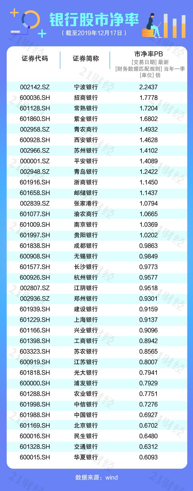 值得注意的是,A股全市场市净率为1.69倍。以此为“及格线”对比银行股,仅有三只银行股“及格”,分别是市净率为2.24倍的宁波银行(002142.SZ),1.78倍的招商银行(600036.SH)以及市净率为1.72倍的常熟银行(601128.SH)。21家银行的市净率在1倍以下,也就是说股价还达不到每股净资产。最低的是华夏银行、交通银行和民生银行PB均没有达到0.65倍。