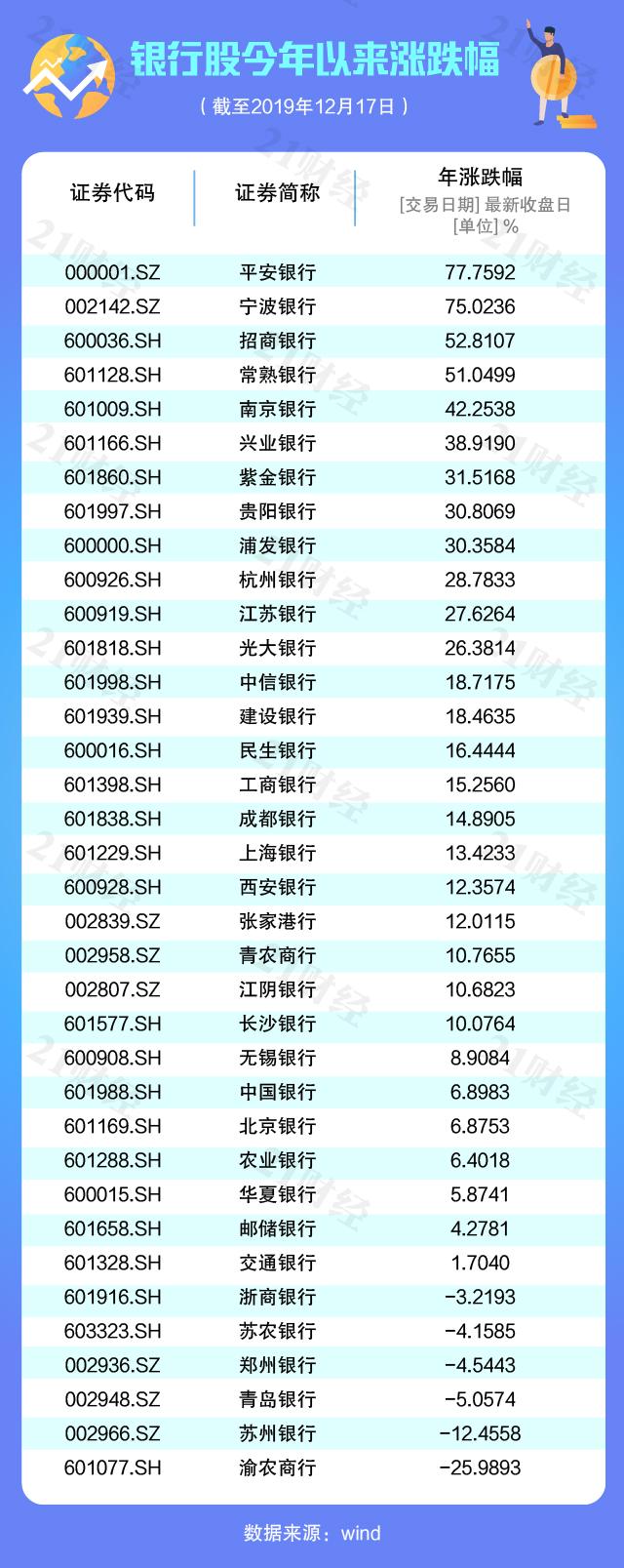 但其实单从股价来看,今年以来部分银行股已经实现了突破。21世纪经济报道根据wind统计发现,2019年至今涨幅最高的是平安银行,为77.76%;宁波银行、招行银行、常熟银行紧随其后,涨幅都在50%以上。但也是喜忧参半。渝农商行、苏州银行、青岛银行、郑州银行、苏农银行、浙商银行股价都较年初或者发行价有所下滑,其中渝农商行较发行价还有超过25%的差距。
