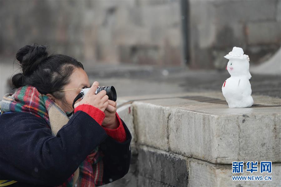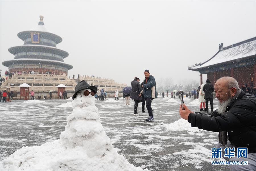 12月16日,在北京天坛公园,一名游客拍摄雪人。 当日,北京迎来降雪天气。 新华社记者 鞠焕宗 摄