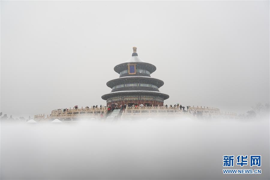12月16日拍摄的雪中的天坛公园祈年殿。 当日,北京迎来降雪天气。 新华社记者 鞠焕宗 摄
